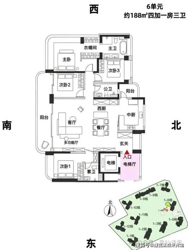 6单元,24层,层高约3.15米,3梯3户,约188平,可售69套;
