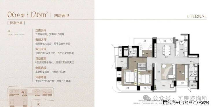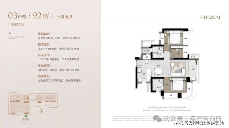 2,新规户型,得房率高,要知道以往福田的户型基本比较拉胯90平米左右做一卫,100多平米做三房,卓越91的三房两卫,104做到了3+1四房,得房率比较不错