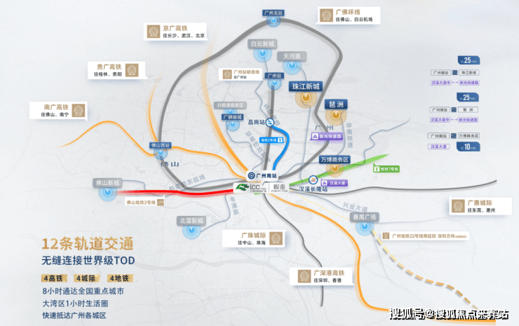 峻銮与广州南站直线距离在500米黄金范围内,占领了中心交通枢纽高地,广州南站的路网建设密度超乎所有人想象——12轨道交汇,涵盖4条地铁、4条高铁及4条城际铁路,30分钟纵享主城繁华生活,1小时大湾区通勤,8小时面向全国。