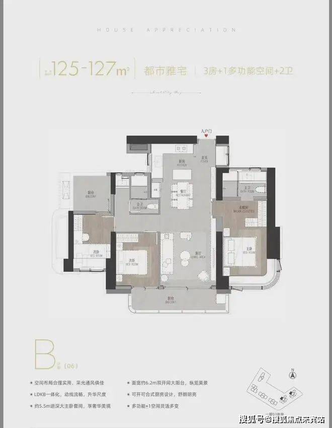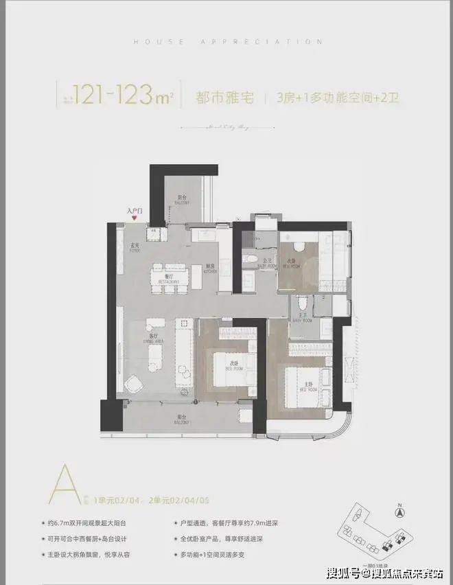 尤其约6.7米开间双面宽大景观阳台设置,以及主卧带大拐角飘窗,外加中西厨及岛台设计,对建面约125平的户型来说非常豪华了,这才是真正的城市核心改善型户型。