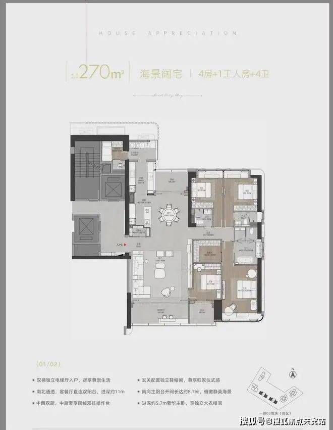 建面约253平户型图建面约253平的面积,奢配一户两部电梯的专属电梯厅入户格局,这种设计目前已经很稀缺了,尽显豪宅公区尊贵大气,让回家充满仪式感 。