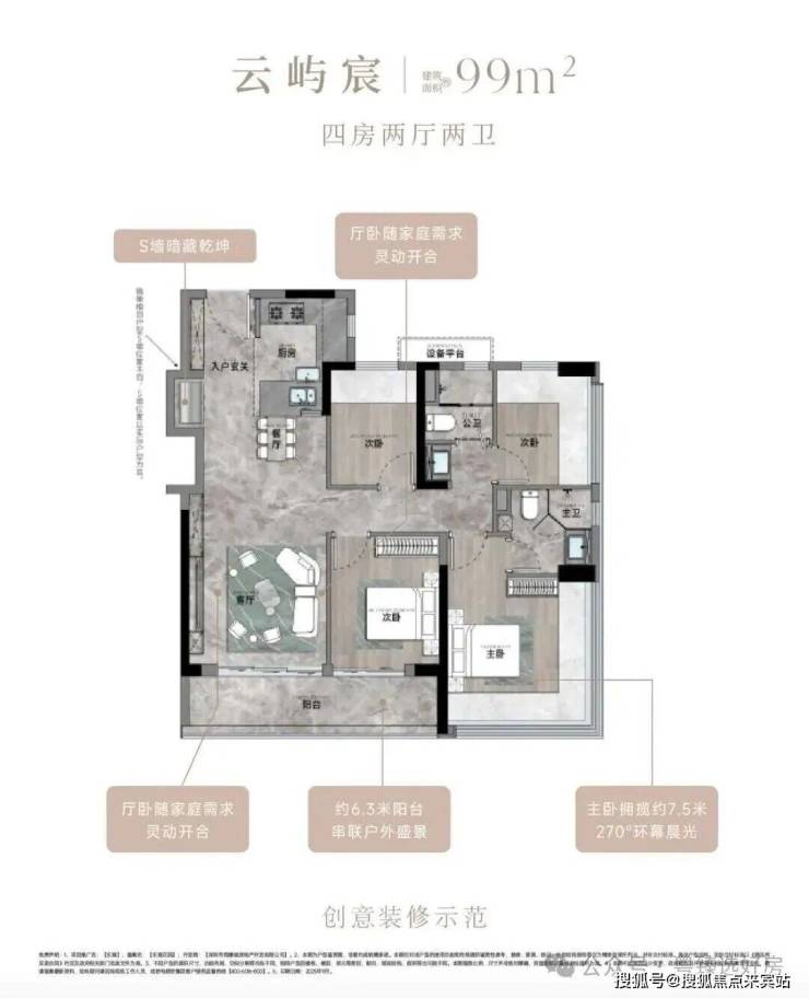 99㎡的4房2厅2卫,设计的是竖厅格局,客厅3.35米开间,LDKB一体化,S墙设计预留双开门冰箱卡槽位,三开间朝南,动静分区,U型厨房,公卫三段式干湿分离,赠送设备平台,得房率约78.27%(不含赠送),客厅连接次卧出9.37m²大阳台西南或东南朝向。靓点:99平做到了4房2卫,主卧270°无柱转角飘窗,厨房烟道外置+额外赠送设备平台,并且是纯南向格局。