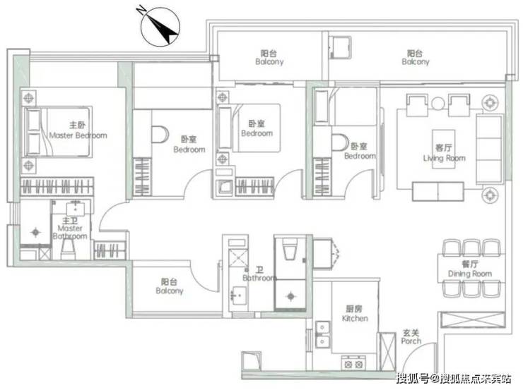 低区01户型,123-126㎡,朝东北,三房两卫,四房需将阳台改房间,改后该房间采光不好: