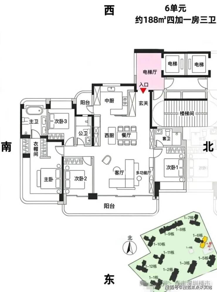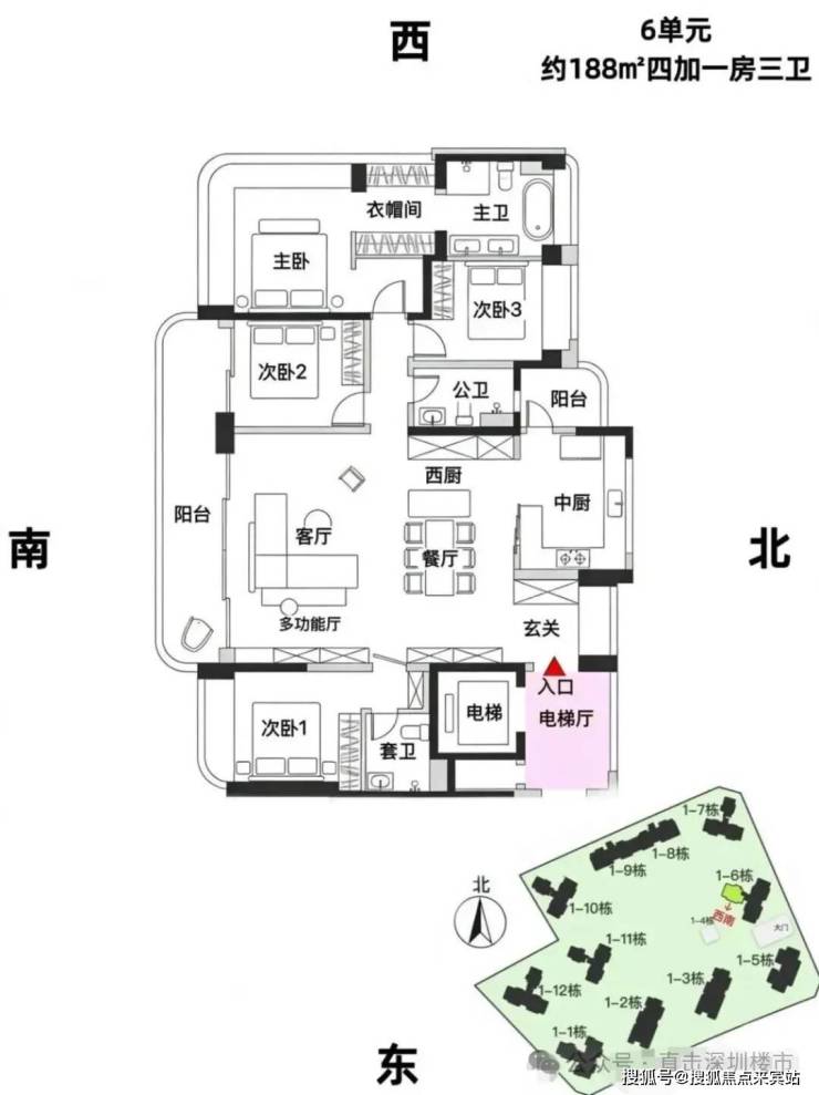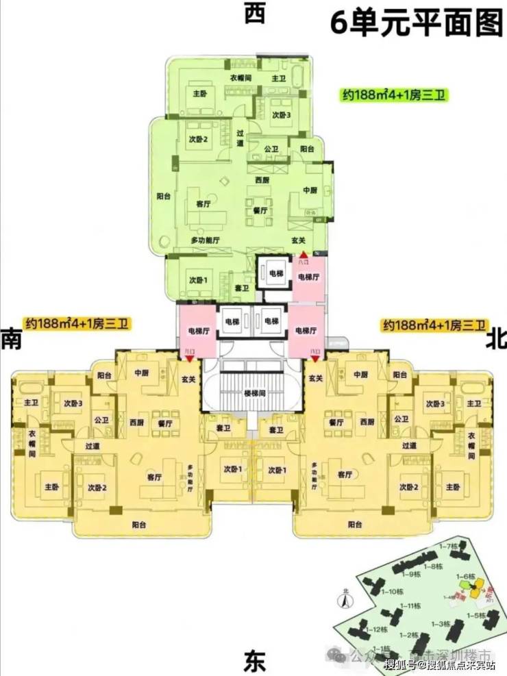 6单元:23层3梯3户、层高3.15m、约188㎡4+1房3卫(双套房双阳台)