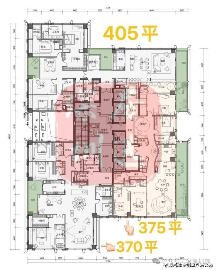 ②高区42F起(150-200米)是约370-375-403㎡4+1房五卫+家庭厅+家政套间;