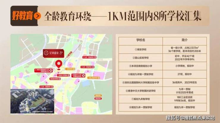 项目自带1所幼儿园,楼下规划一所学校,距离约400米处还规划在建有深圳北理莫斯科大学附属九年一贯制学校,总占地面积约7万㎡,规划36班1800人,将于2024年7月份建成。