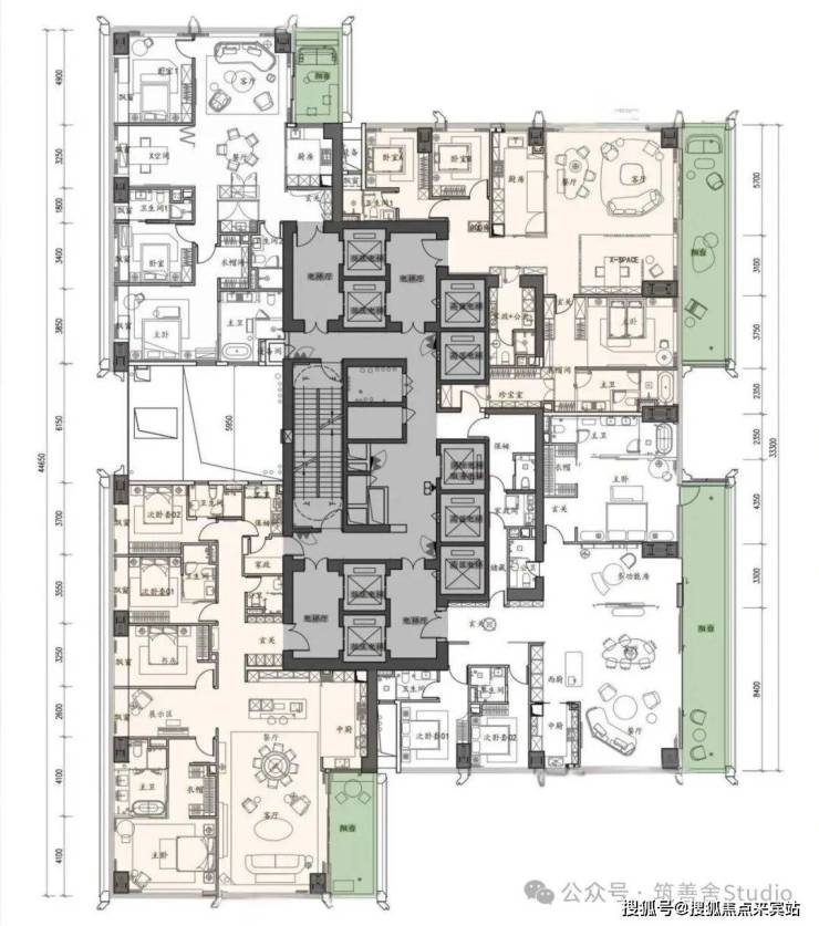 高区(42-58 层,150–200 米):370–403㎡ 4+1 房五卫(家族型)