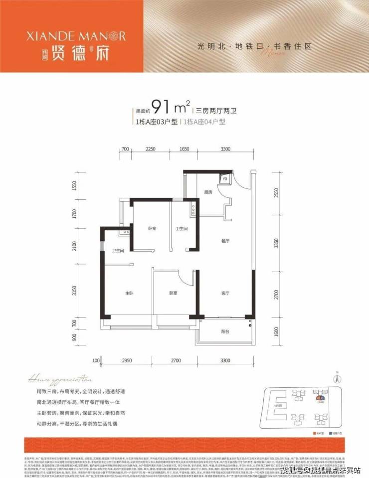 A、91平米:3房2厅2卫,正南朝向;