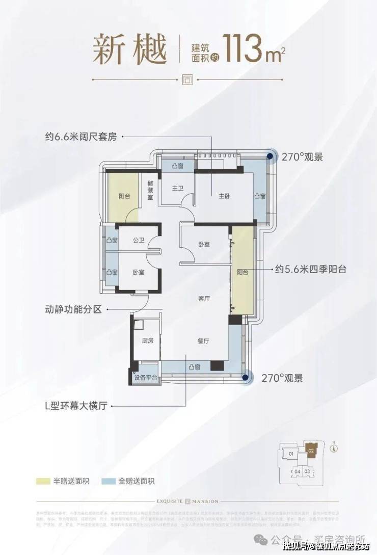 目前91-113㎡户型已经出炉,123㎡户型暂未公布,其中113㎡户型是个亮点,客厅房间基本都是270°转角飘窗采光,使用率高达94%