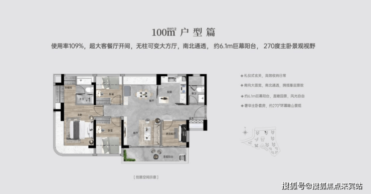 建面约100㎡ | 三房两厅两卫(B户型),独立入户玄关,多面宽朝南,约5.9m百变宽厅,主卧270°弧形飘窗。