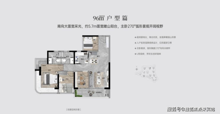 建面约96㎡ | 三房两厅一卫(A户型),礼仪式入户玄关,高效拓展收纳空间;约5.7m阳台,主卧270°弧形飘窗瞰山景。