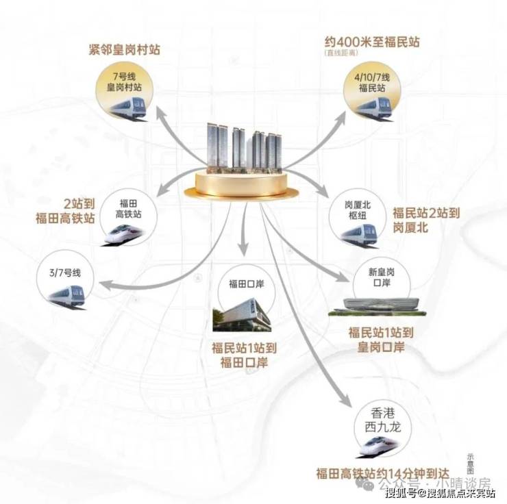 项目紧邻地铁7号线皇岗村站(E/D/C1/C2口直达),步行距离约100米。距离4号线/10号线福民站约300米,距离3号线石厦站约500米。