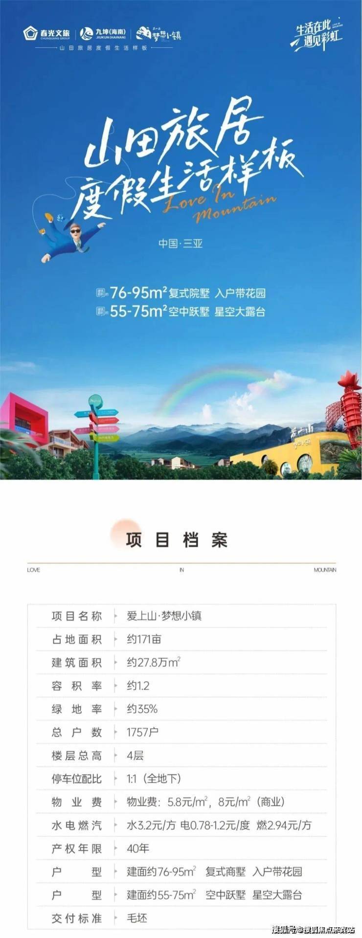 爱上山·梦想小镇项目占地171亩,总建面约27.8万方,容积率为1.2,绿化率35%,产权年限40年,总规划户数1765户,车位数1742个,车位比例1:1,物业公司:信佳安泰物业有限公司,物业费5.8元平,商业部分8元/平