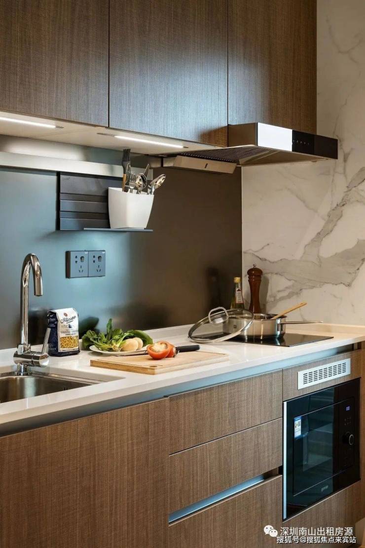 在公寓的厨房区域,全套厨电设备则采用欧洲高端家电品牌格兰尼Gorenje,冰箱、微烤一体机、全自动洗碗机、洗烘一体机等一应俱全。