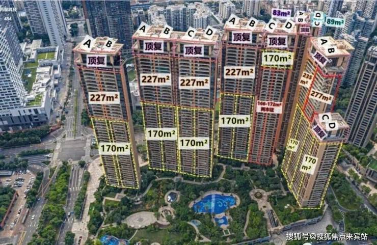 面积段:主力为170㎡(3-30层)和228㎡/235㎡/277㎡(31层以上)。