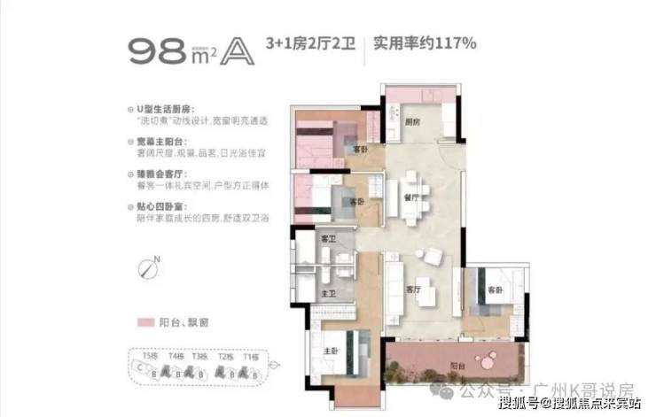 约98平户型,可改造为3+1房2厅2卫格局,适合改善家庭一步到位。比较大的看点就是主卧自带大飘窗,客卧与主阳台直接连通。