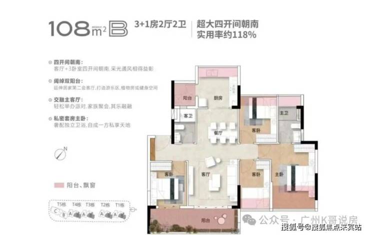 整个项目有5栋10层南向板楼,三个户型分别是98平、108平和156平,全四房设计。