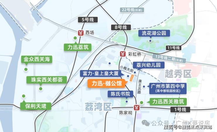 项目地块所处的位置,在老荔湾康王北路,距离越秀仅一公里,500米内拥双地铁:陈家祠站(1/8号线)和彩虹桥站(8/11/13/22号线),交通很方便。