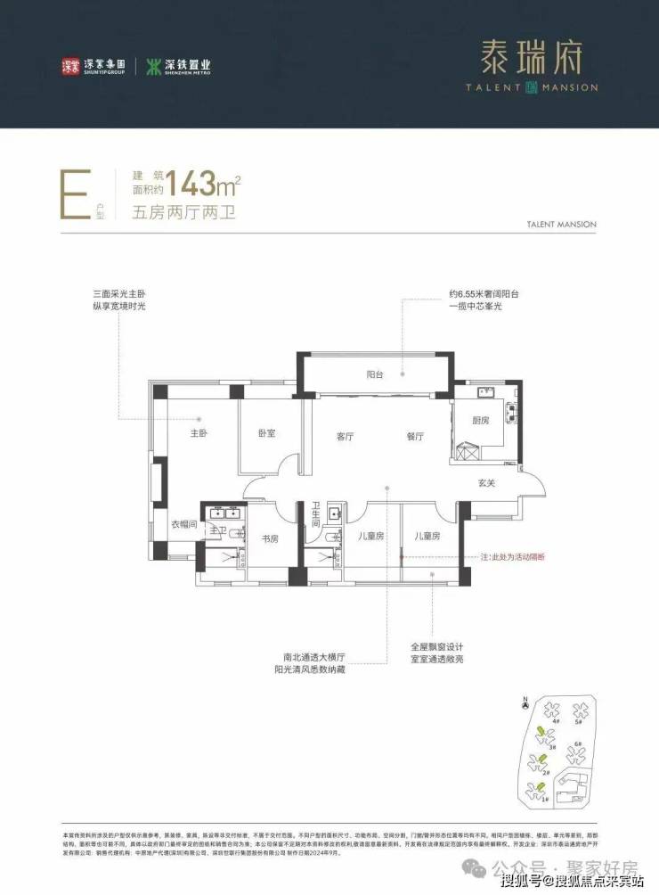 143㎡的5房2厅2卫,折后总价619-668万/套,单价4.33-4.67万/㎡,对比1栋同楼层下调约34-39万!设计的是横厅南北通透格局,进门入户玄关,客餐厅6.55米开间,四开间朝南,5个卧室分别做的3.9米/2.55米/2.48米/2.47米/2.35米/的宽度,U型厨房,公卫三段式分离,得房率:77.48%(不含赠送),阳台主朝东南或西南向。