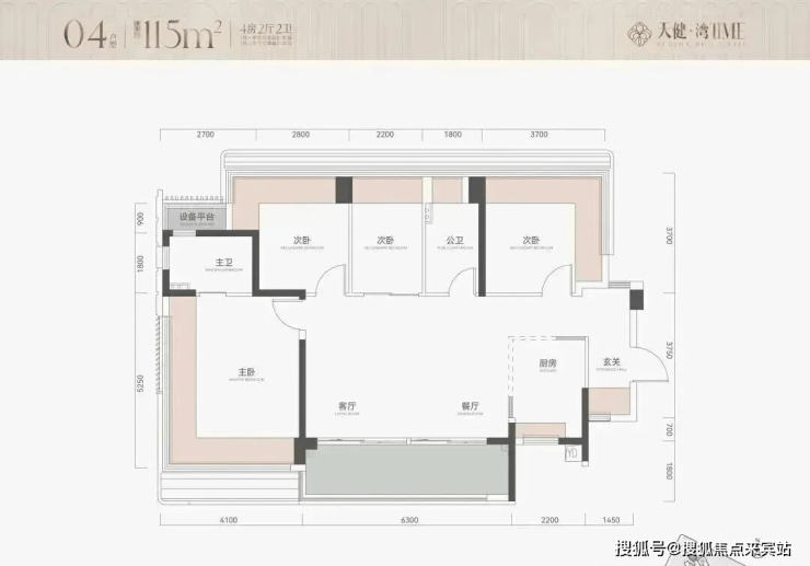115㎡4房2卫,横厅户型,朝南看海,入户独立玄关,但三个次卧朝北;