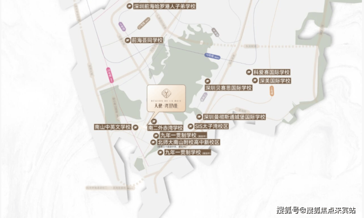 从幼儿园到高中的完整教育链,满足不同家庭的教育需求。项目对口南二外(集团)赤湾学校(九年一贯制公办学校),该校创办于1964年,规模为36个班(小学26班、初中15班),现有学生近1700名,教师114人,其中25%具有硕士学位,挂牌教师比例位居南山区公办学校前列。该校秉持"为孩子的幸福人生奠基"办学理念,构建"无边界学习"体系,开发统整大课堂、STARS课程以及写字课、阅读课、赤湾讲坛课、音乐欣赏、棋类课等校本课程,组建文学社、数学俱乐部等70余个学生社团。该校特色在于校园设计融合山海景观,屋顶花园与岭南庭院提升学习环境,且已获评2008年南山区"教育现代化示范学校"等称号 。
