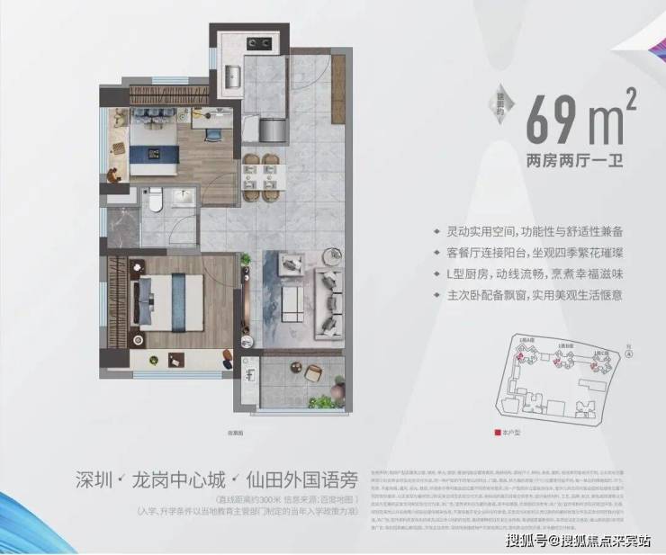 69㎡的2房2厅1卫,设计的是竖厅格局,客餐厅一体化,L型厨房,得房率:70.9%(不含赠送),阳台西南朝向。