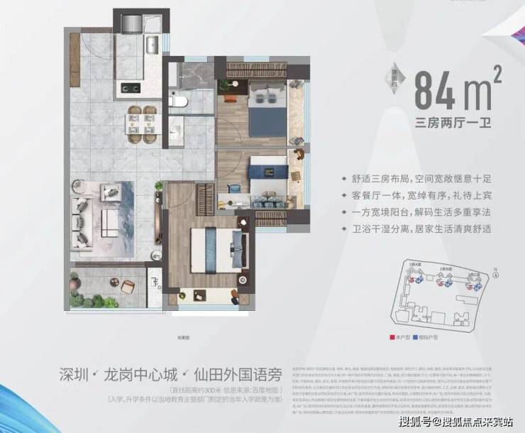 84㎡的3房2厅1卫,设计的是竖厅格局,客餐厅一体化,L型厨房,卫生间三段式分离,得房率:70.9%(不含赠送),阳台朝西南或东南向。
