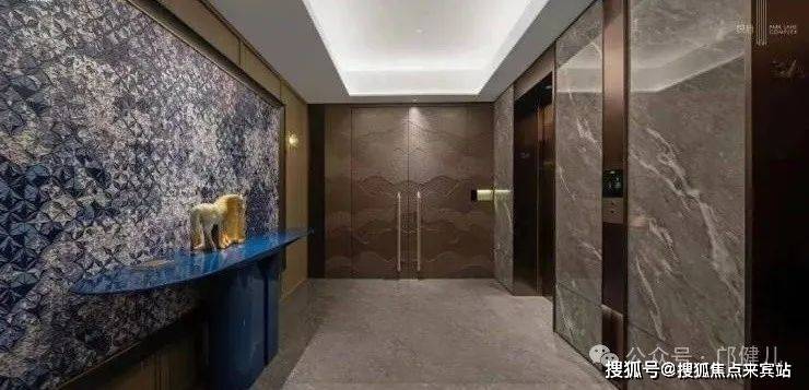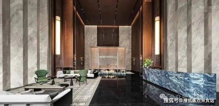 首层大堂约12米层高、约260㎡面积,水云灰石材墙面、太古黑金石材地面、紫山奢石接待前台,呈现出奢华酒店般的恢弘气度。