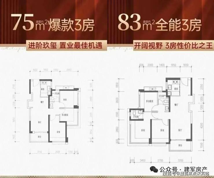 75㎡三房两厅一卫,总价354-370万,单价约4.7-4.91万/㎡