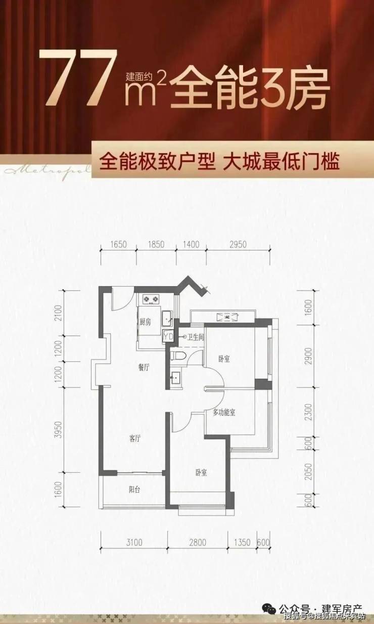 77㎡三房两厅一卫,折后总价约350-374万,折后单价约4.51-4.83万/㎡