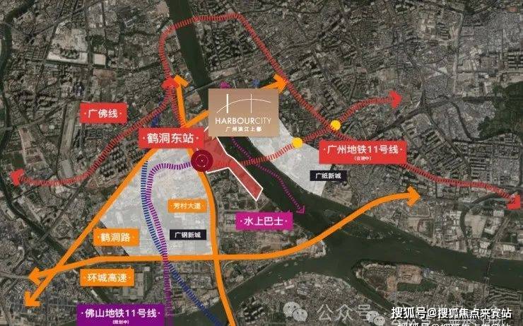 广州地铁11号线及佛山地铁11号线两大城市轨道交汇换乘于鹤洞东站,广州滨江上都以此依托11号环线,与琶洲、泛珠江新城以及天河北等重要经济生长板块串联,凸显出比肩东部CBD的地段价值。