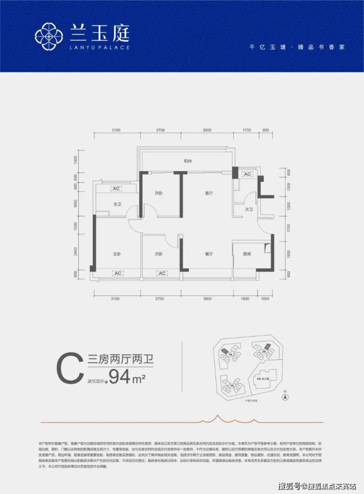 94㎡的3房2厅2卫,C户型,设计的是竖厅南北通透格局,客厅开间3.5米,3个卧室分别做到了3.1米/2.7米/2.7米的宽度,客厅连接次卧出6.2米长的大阳台,U型厨房,公卫三段式分离,得房率约79%(不含赠送),阳台主朝西北或东北向。
