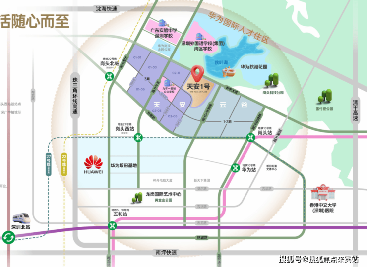 作为坂田北最大体量旧改项目,天安云谷位于坂田街道冲之大道和坂李大道的交汇处,毗邻地铁22号线岗头北站(建设中)。项目占地面积约13.14万㎡,由8个地块组成,建面约128万㎡,集产业、办公、居住、商业等于一体。其中,三期是天安云谷首个包含住宅的项目,建成后将有21栋住宅+2栋酒店+2栋公寓办公,预计提供住宅5886套,保障房640套。