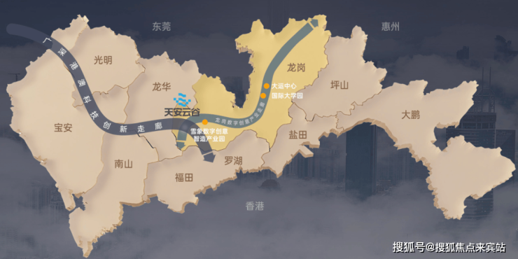 位于龙岗区坂田街道坂雪岗科技城,该项目共分6期开发,总规划占地面积约76万㎡,总建筑面积约400万㎡,总投资300亿人民币,是国内首个以“云计算、大数据”理念规划的智慧园区,聚集了云计算、物联网、移动互联网等信息技术产业及智能设备,机器人等产业,是深圳现代产城融合的标杆之作。