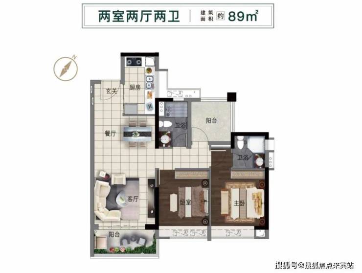 89㎡户型三开间朝南,南向望园林,独享阳光景观,主卧套房设计,更具私密性。