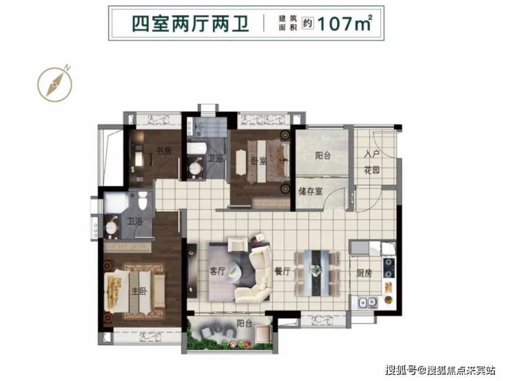 107㎡户型则是横厅设计,四开间朝南,两处灵动空间,可以灵活打造满足不同居住需求。书房、卧室、主卧、餐厅都带飘窗,解决收纳难题。