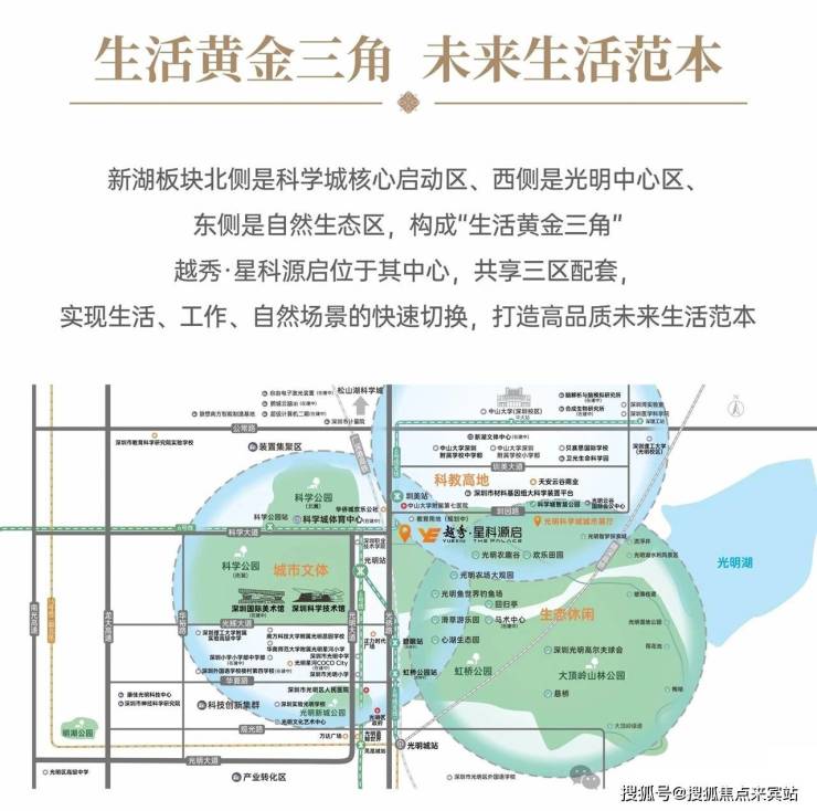 新湖板块北侧是科学城核心启动区、西侧是光明中心区、东侧是自然生态区,构成“生活黄金三角”。