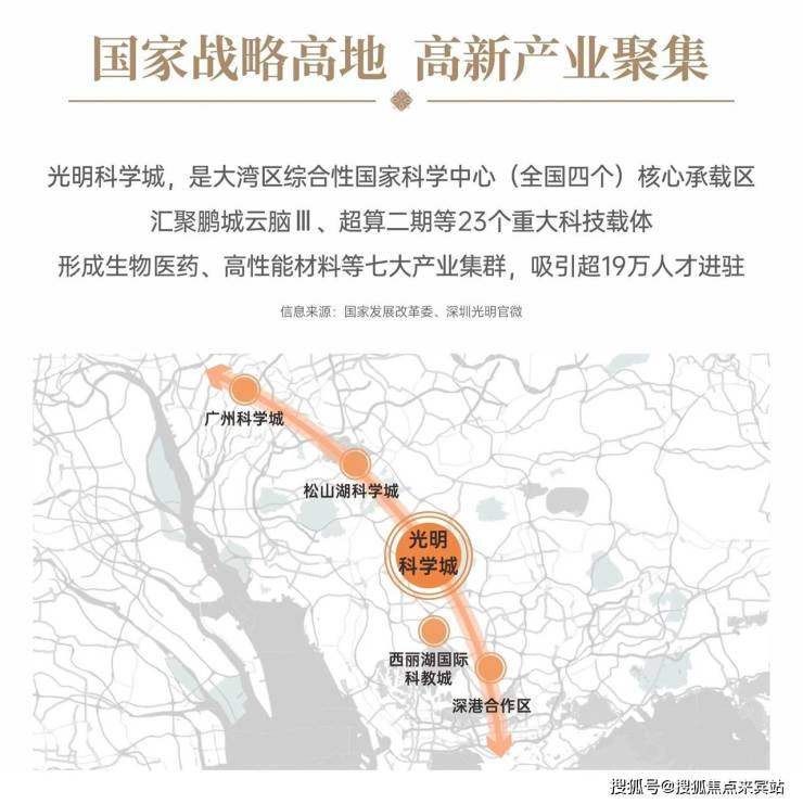 光明科学城,是大湾区综合性国家科学中心(全国四个)核心承载区,汇聚鹏城云脑Ⅲ、超算二期等23个重大科技载体,形成生物医药、高性能材料等七大产业集群,吸引超19万人才进驻。