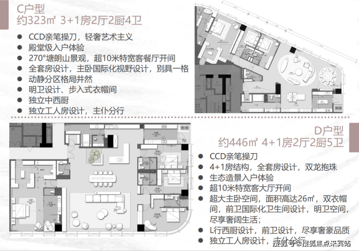 荟萃CCD、柏朗国际两大设计团队联袂匠造,以国际化视野,精研侨城湾芯云端新作,仅28席,位于建筑23-29层,全高区景观视野,建面约323-446㎡,纯粹大户云端居所。4款室内设计风格独特,尺度阔绰,兼顾细致实用,畅享舒适空间。