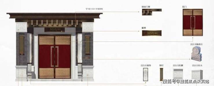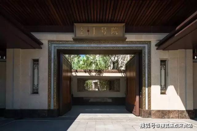 泰禾壹号院,大门、院门、宅门三进大门,采用民间居住等级最高的广亮大门形制,材料上采用葡萄牙米黄石材、汉白玉门框、纯实木大门及锻造工艺纯铜雕刻,呈现千百年来高门大户之风貌,显赫大家门风。
