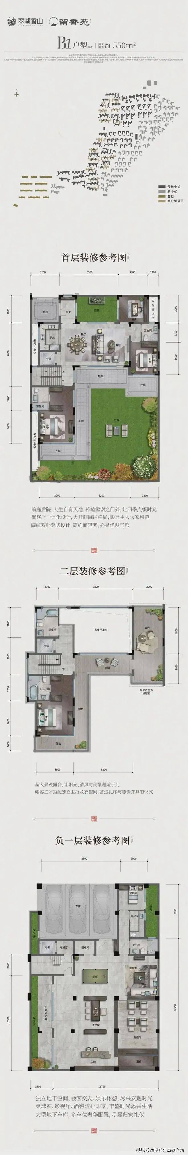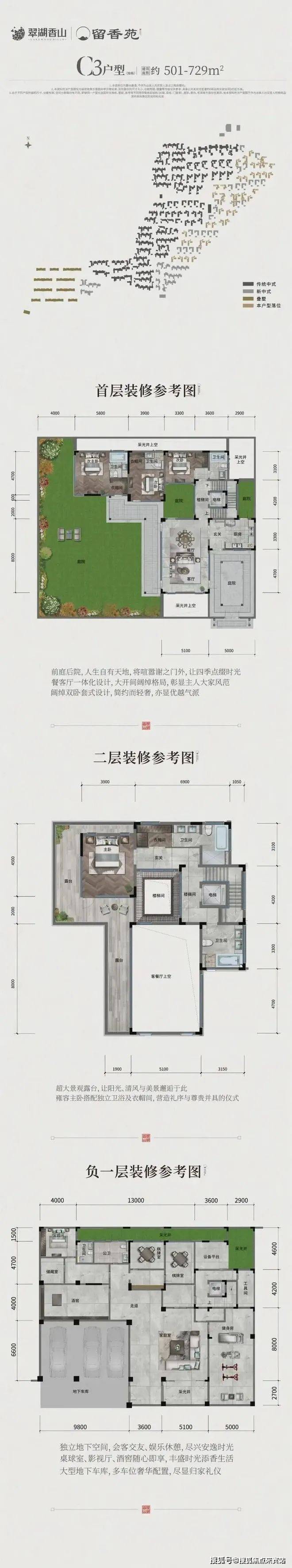 450-1711㎡传统中式及新中式独栋;308-762㎡传统中式及新中式合院;196-421㎡现代叠墅。