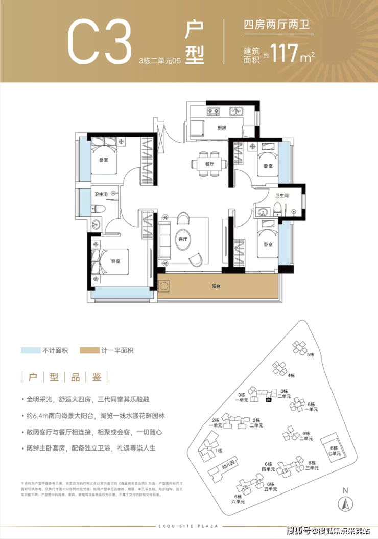 117㎡的4房2厅2卫(C3),得房率:72.06%(不含赠送),约6.4米长的超大阳台,正南朝向看花园景观。