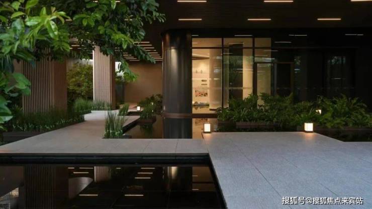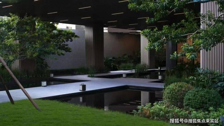 园林:主打聚水为财的氛围。项目在园林中轴位置,叠加了泳池、叠水、草地。