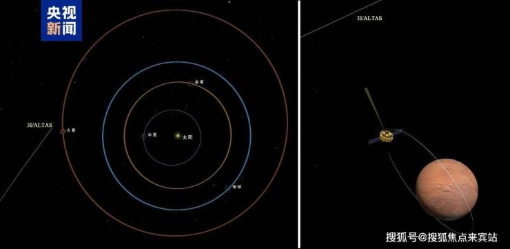 星际天体阿特拉斯与天问一号火星环绕器相对位置示意图。(图片来源:央视新闻)