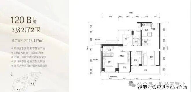 120㎡:客厅与卧室连通9.6㎡超大阳台,主卧带5.2㎡衣帽间,还有观景小阳台,主要为东南和西南朝向