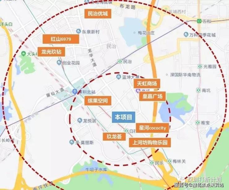 百万商圈,出入繁华,北站商圈:缤果空间,红山商围:龙华天虹购物中心、红山6979世界大型零售知名企业沃尔玛、莱蒙领尚购物中心、华润万家、佐阾香颂购物中心、迪卡侬、龙光玖钻商业,白石龙商圈:星河cOCOCity、上河坊购物乐园、玖龙荟。