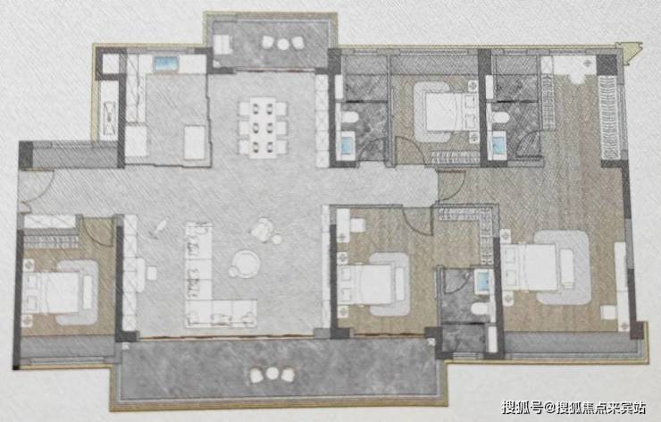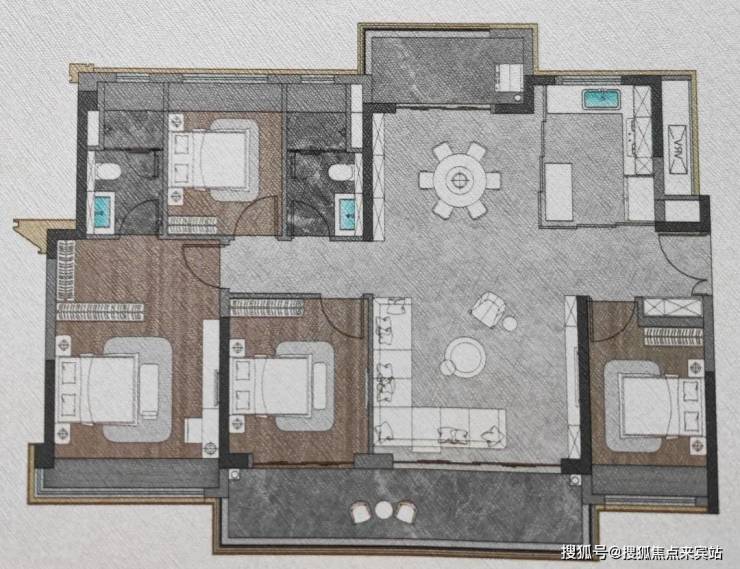 143㎡四房布局与128㎡大致相似,不同的是带南北双阳台。