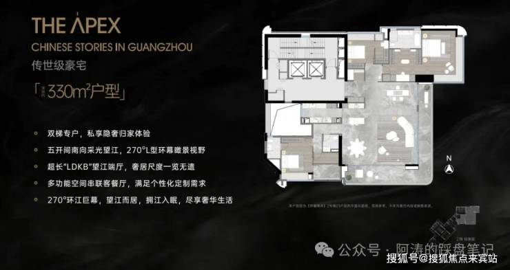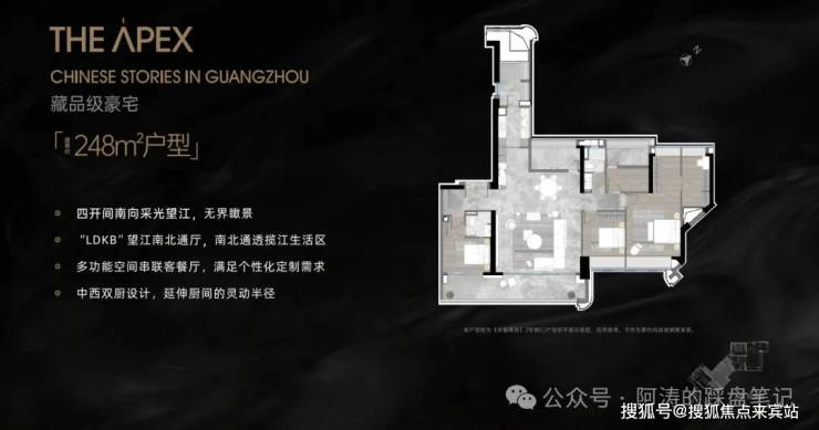 琶洲·樾 | 华樾的户型设计秉承顶级豪宅理念,主要推出248㎡、253㎡、330㎡的超大平层,采用2梯2户、2梯1户布局,超大阳台+全玻璃幕墙,让每一户都能享受极致景观视野。项目特别将楼体旋转45°,使得2/3的单位为东南向,符合广州人对风水和采光的极致追求。此外,高层住户还能远眺珠江支流黄埔涌及琶洲南TOD滨河公园,实现真正的城市江景奢华生活。