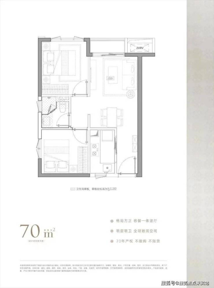 70平两房,竖厅格局,全明通透,通风采光及舒适度都是最好的,也比较贴近住宅家庭需求,功能空间开阔,拥有独立厨房和景观阳台。