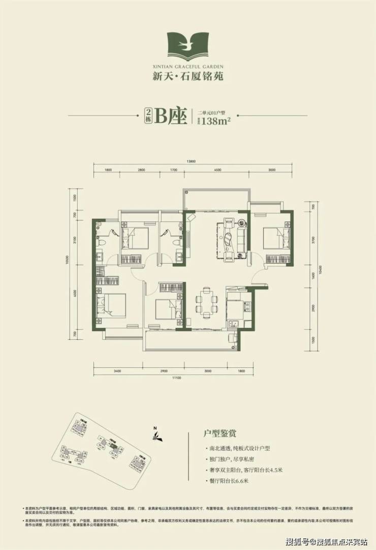 2栋B座一单元01、04户型、2栋B座二单元01户型:面积约为137-138㎡的4房2厅2卫